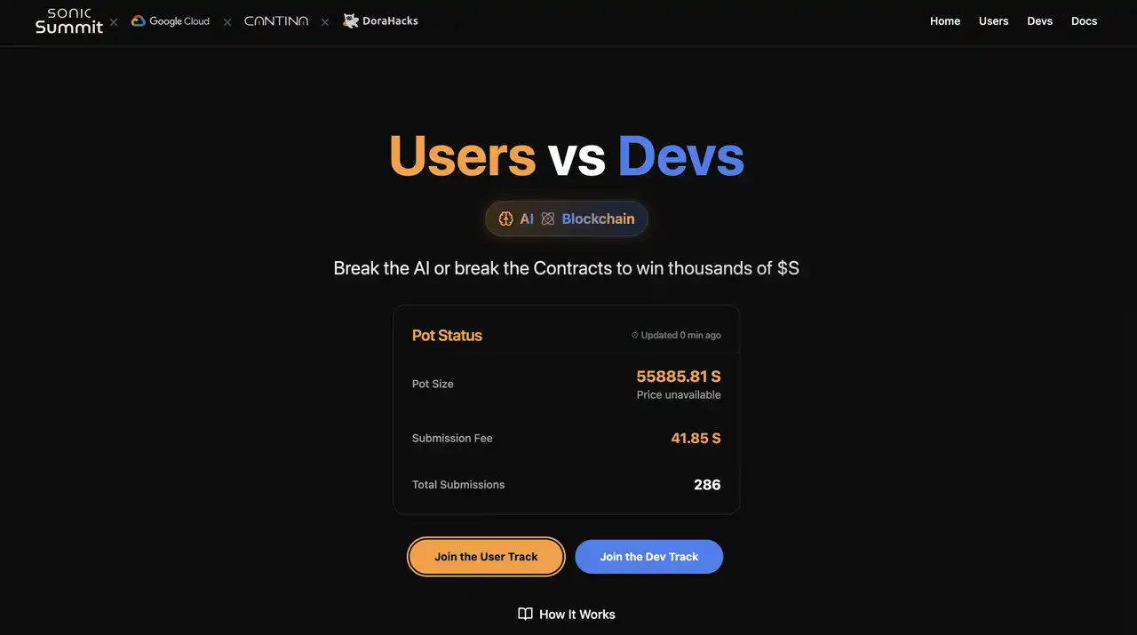 在举行 Sonic Summit 期间 Sonic 还举办了一个有意思的小游戏,不会编程的用户「Users」可以通过「诱骗 AI」参与,参与者需通过设计巧妙的提示,诱导由 Google Gemini AI 守护的系统泄露一组私钥。每次提交提示需支付一定数量的 S 代币,费用逐渐增加并计入奖金池。成功提取私钥并通过验证的用户将赢得奖金池。