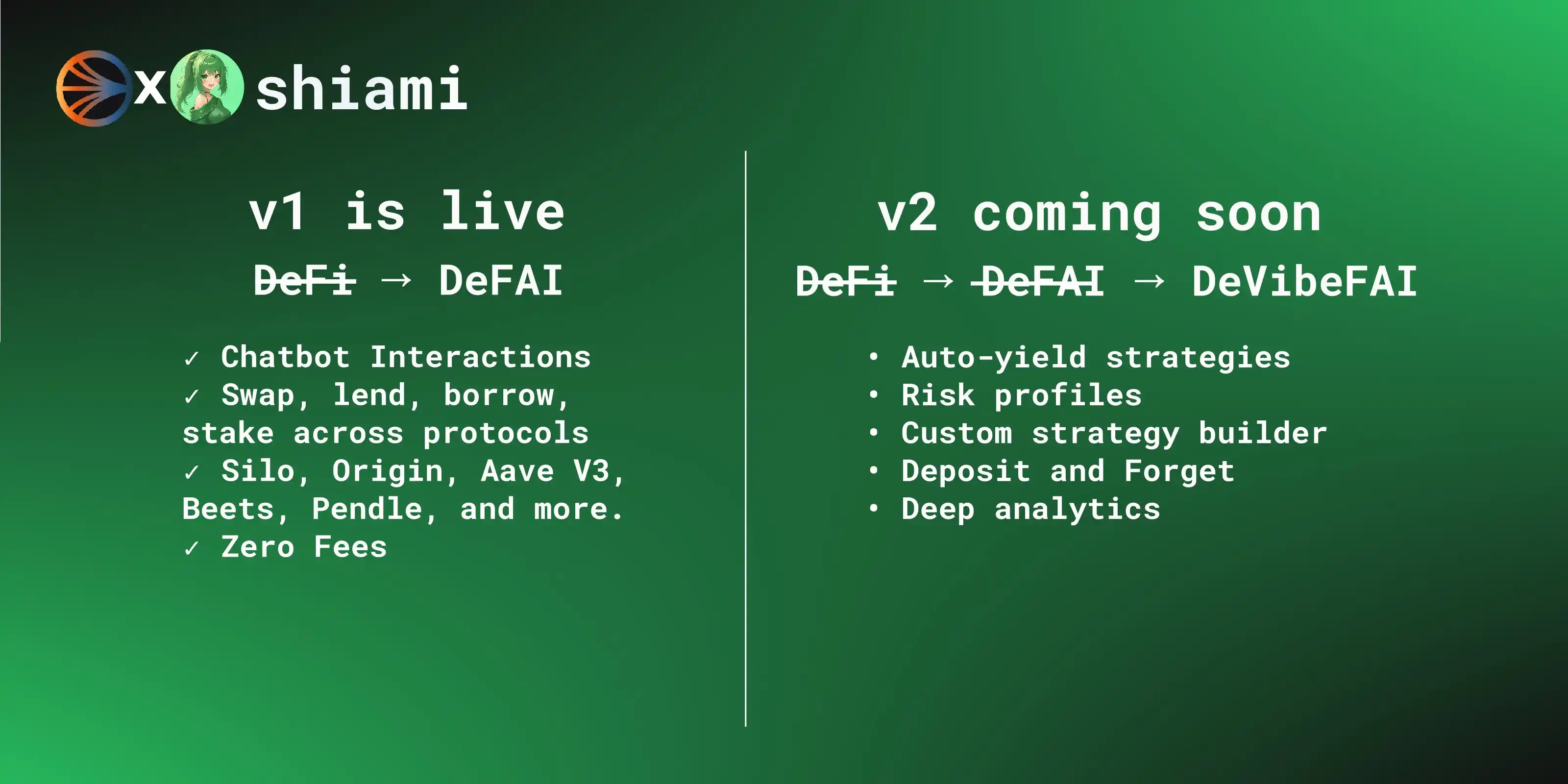 在四月初结束的 @SonicLabs和@DoraHacks 联办的 DeFAI 黑客马拉松中获得了第二名,现已支持 Silo Finance、Aave V3、Beets.fi、Pendle Finance、Shadow 等主流 DEX 以及 Angles, Beets, Beefy 等 Sonic 原生的质押平台。在接下来的 V2 版本特别提出了一个新的概念,将 DeFAI 晋升至 DeVibeFAI,「Vibe」一词在最近 AI Agent 的热潮中十分常见,Vibe Code 意指无需编程基础仅通过自然语言进行编程的概念。