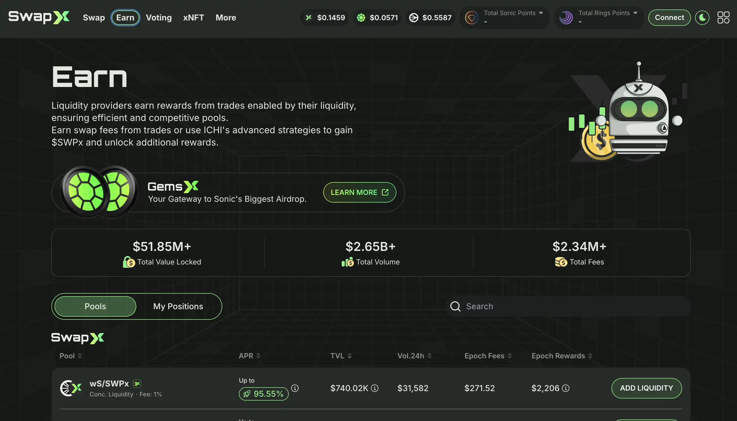 SwapX 是 Sonic 上的多功能型 DEX,集成了 Algebra 的 Integral V4 平台「类似于 Uniswap V4 的 HOOK」,集中式流动性机制、自动化流动性管理和插件式架构,这几种技术的结合带来低滑点高深度的交易体验。