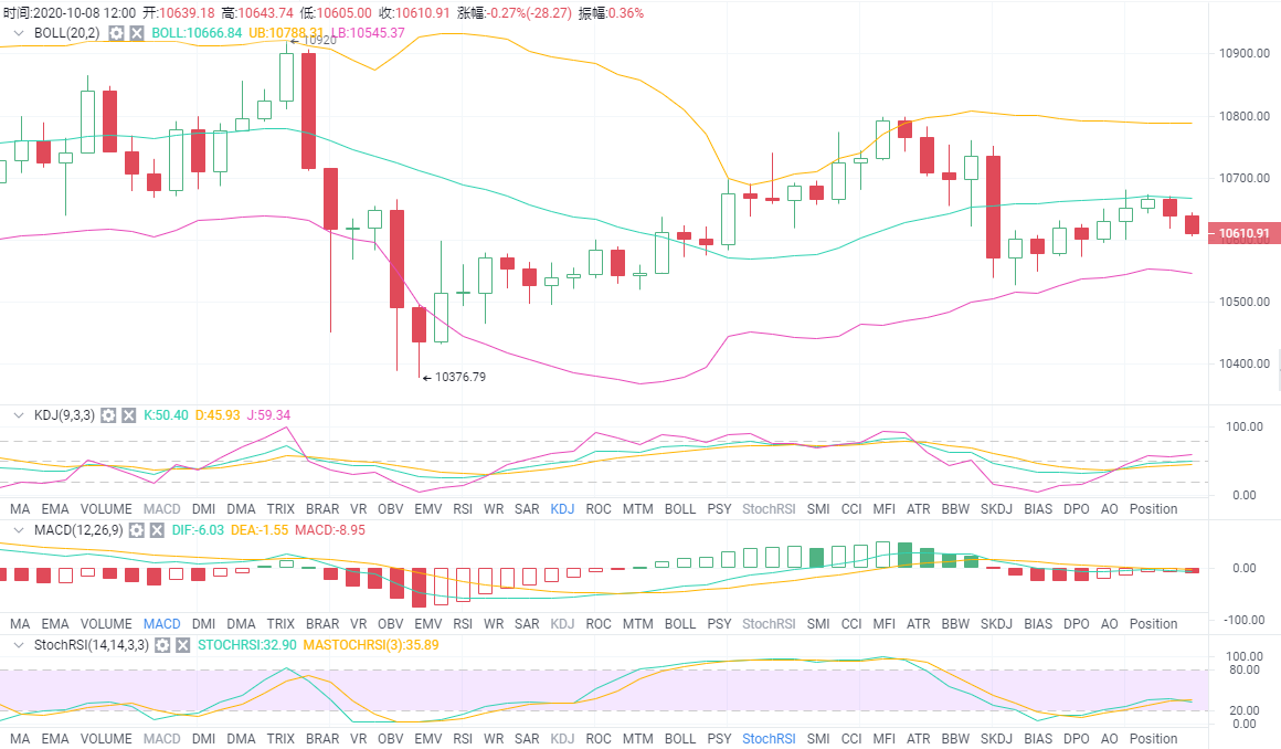 BTC:四小时级别线来看,布林带开口呈下姿态,各项指标均在中下轨运行,Skdj与RSI有拐头迹象或将行成死叉,币价预计会先走出一步回撤再反弹。近日行情并未进一步下行跌破10500关键位置,造成局势恶化,短期盘面还是需要继续观察。可以关注12小时线和日线这里的三角能否突破出方向。目前价格在缓慢上行,行情正在尝试寻找方向,情况在逐渐好转,但是多头上攻力度不够强烈,短期行情还是需要耐心等待方向。