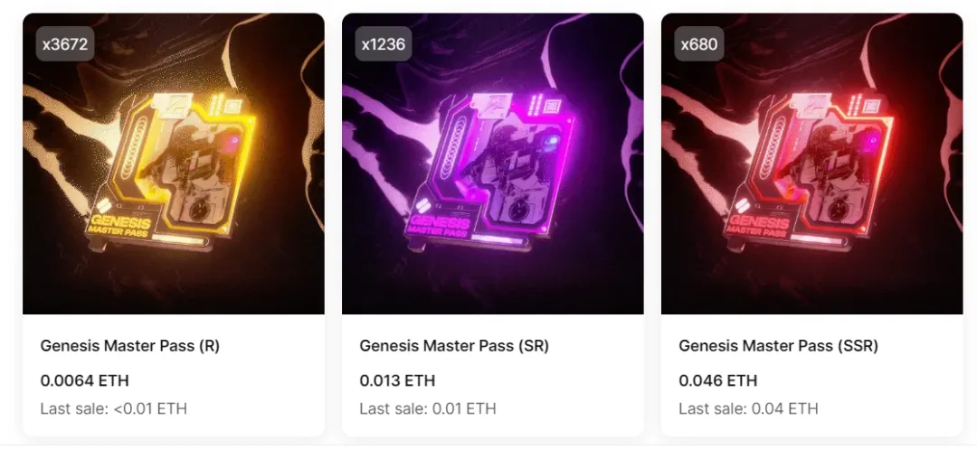 除了质押获得积分,Genesis Master Pass 还推出合成玩法,形成一个通缩循环, 3 张 R 卡可以合成为一张 SR 卡,三张 SR 卡可以合成为一张 SSR 卡。因此,Pass 卡的数量会越来越少越来越稀缺。