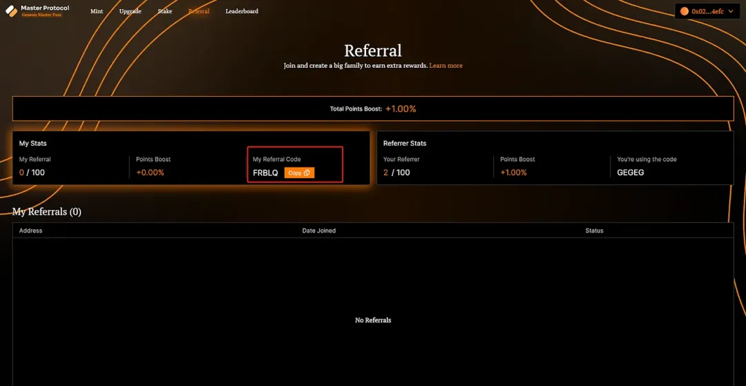 持有者质押 NFT 后,可以获得自己的专属邀请码。通过邀请其他的持有者质押,双方都能够获得额外的积分加成奖励。邀请的用户越多,奖励的积分就越多,未来的空投数量就越多。通过邀请朋友,最多可以获得高达 50% 的积分加成奖励。