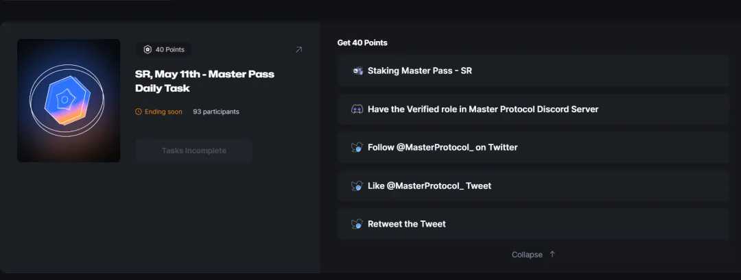 SSR NFT 质押后自动获得积分,SR 和 R NFT 需要完成每日任务,获得积分。