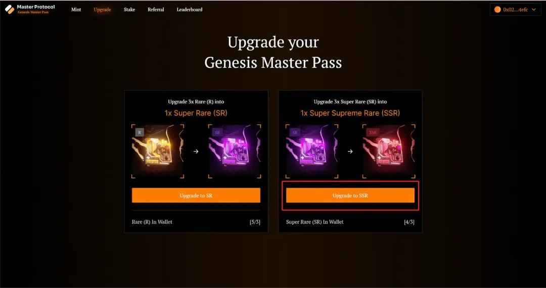 准备好至少三张 R 或者 SR 等级的 NFT,点击页面顶部的 Upgrade,点击要升级的 NFT 下方的 Upgrade to SSR/SR。