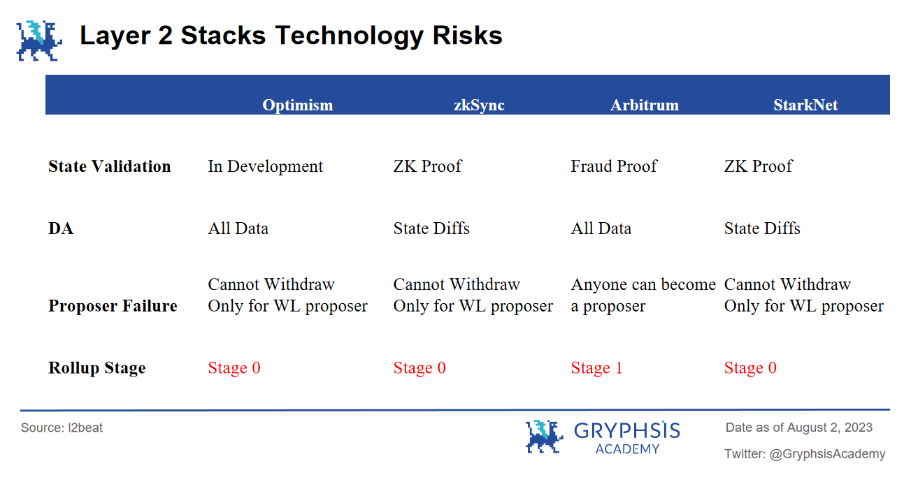 此外的 zkSync 和 StarkNe t 都采用了 ZK Proofs,且 Rollup Stage 处于相同阶段。