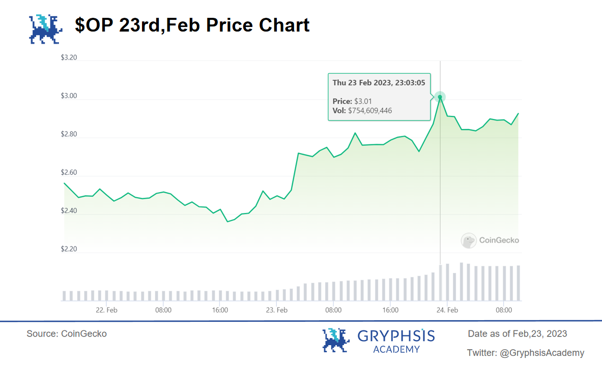 可以看出,在 2 月 23 号当日,$OP 的价格一度上升到$ 3.01 。其大概率是因为在晚上 10.30 左右 Base 在 OP 主网发布了合作 NFT,随即晚上 11 点左右价格开始飙升到最高值,随即回落。