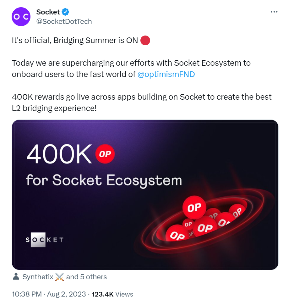Bridging Summer: 2023 年 8 月 3 日,OP 官方资助了 Socket 跨链协议, 40 万 $OP,任何 Bridging Summer 的项目上跨链的,都会返还一定金额的 $OP。比如你从 Polygon 到 OP,进行价值 $ 100 U 的跨链,如果你需要支付 $ 2.5 的费用,那么同时你会收到 $ 2.25 价值的 $OP,并且每月可以去领取。