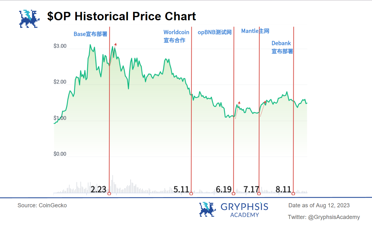 以 OP Stack 为例,目前 opBNB, ZORA, Base, Mantle, Worldcoin, Debank 相继站队 OP Stack,其对 OP 的价格影响较大,不过由于时间线限制,无法直观的看到单日的增长态势,因而,我们暂时选取 Base 宣布部署当日 $OP 的价格变化: