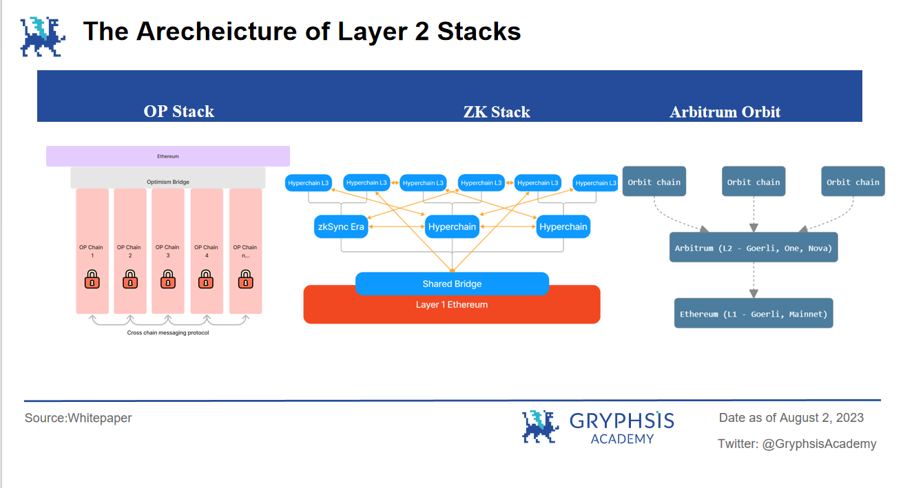 OP Stack 利用共享跨链桥进行资产传递,所有用 Stack 方案创建的 OP Chain( 1-n) 都与 OP Mainnet 平级。ZK Stack & Arbitrum 底层结构类似,不过支持 L3, L 4 的增发,形成一个可扩展的超链网络; Polygon 2.0(作为侧链暂不列在表中) 以以太坊作为质押层,现在有的 Polygon zkEVM 公链与超链并行运作,共享互操作层。
