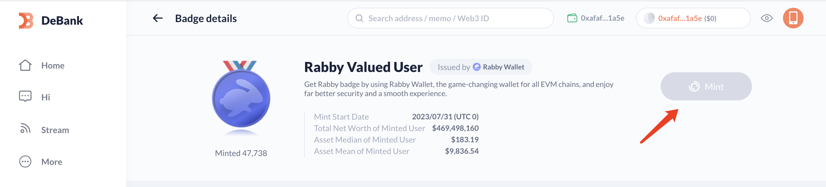 5.按照钱包指引,需要先跳转到 DeBank,然后 mint 一枚名为“Rabby Valued User”的徽章。