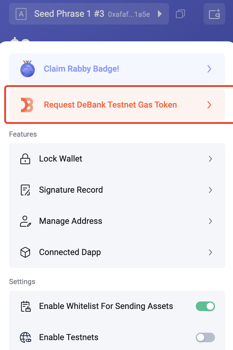 目前,我尚未发现 DeBank Chain 的 RPC URL,因此不能从 MetaMask 手动添加。但测试网现已集成到 Rabby Wallet 中,并内置了一个测试币水龙头,用户如想体验,就先使用这一钱包吧。参与流程并不复杂: