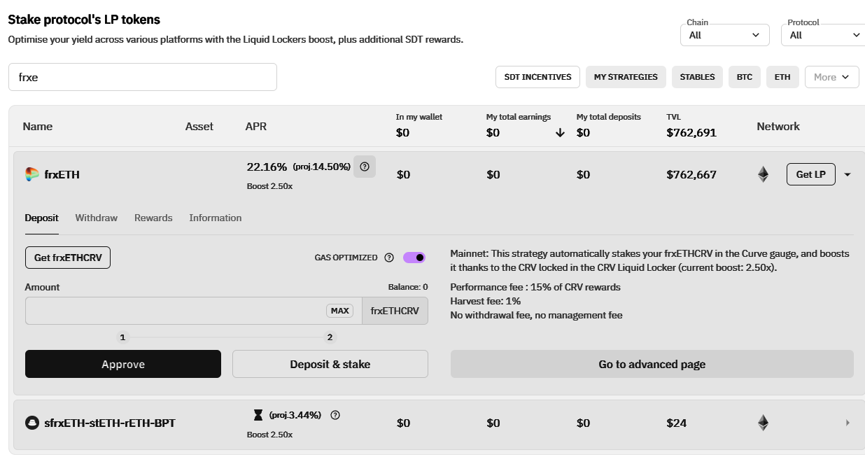 如果你将 frxETH 存入 Stake DAO,该协议会将其存入 Curve gauge,,并通过锁定在 CRV Liquid Locker 中的 CRV 来进一步提高激励。