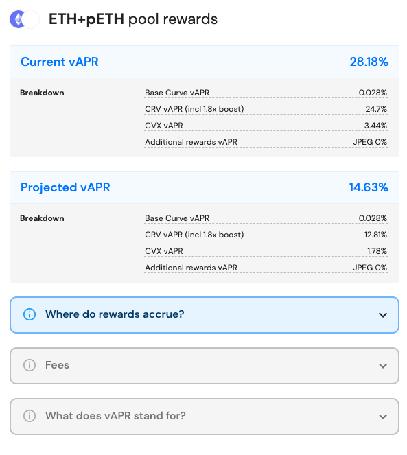 当前,如果你在 pETH - ETH 池中的存入流动资金,并将相应的 LPs 代币质押在 Convex Finance 上,即可获得 28% 的 APY 奖励。