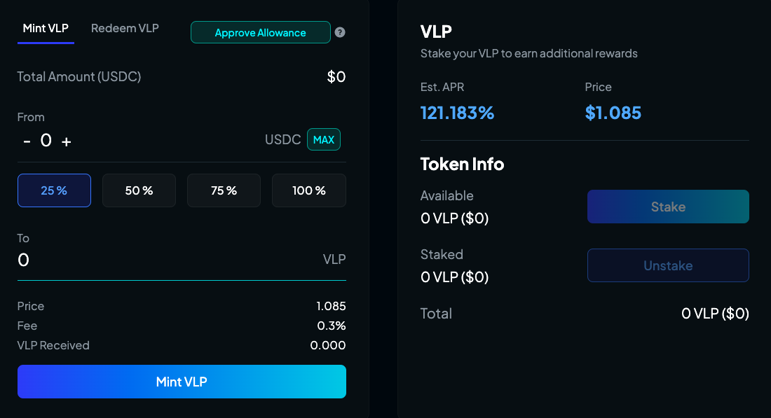 VLP 是 Vela 上的流动性凭证代币,可使用 USDC 铸造生成。VLP 铸造者将会基于 Vela 的交易量获得奖励,目前的质押 APY 大于 120% ,其中包括 60% 的平台费用收益和 10% 的资金费率收益。