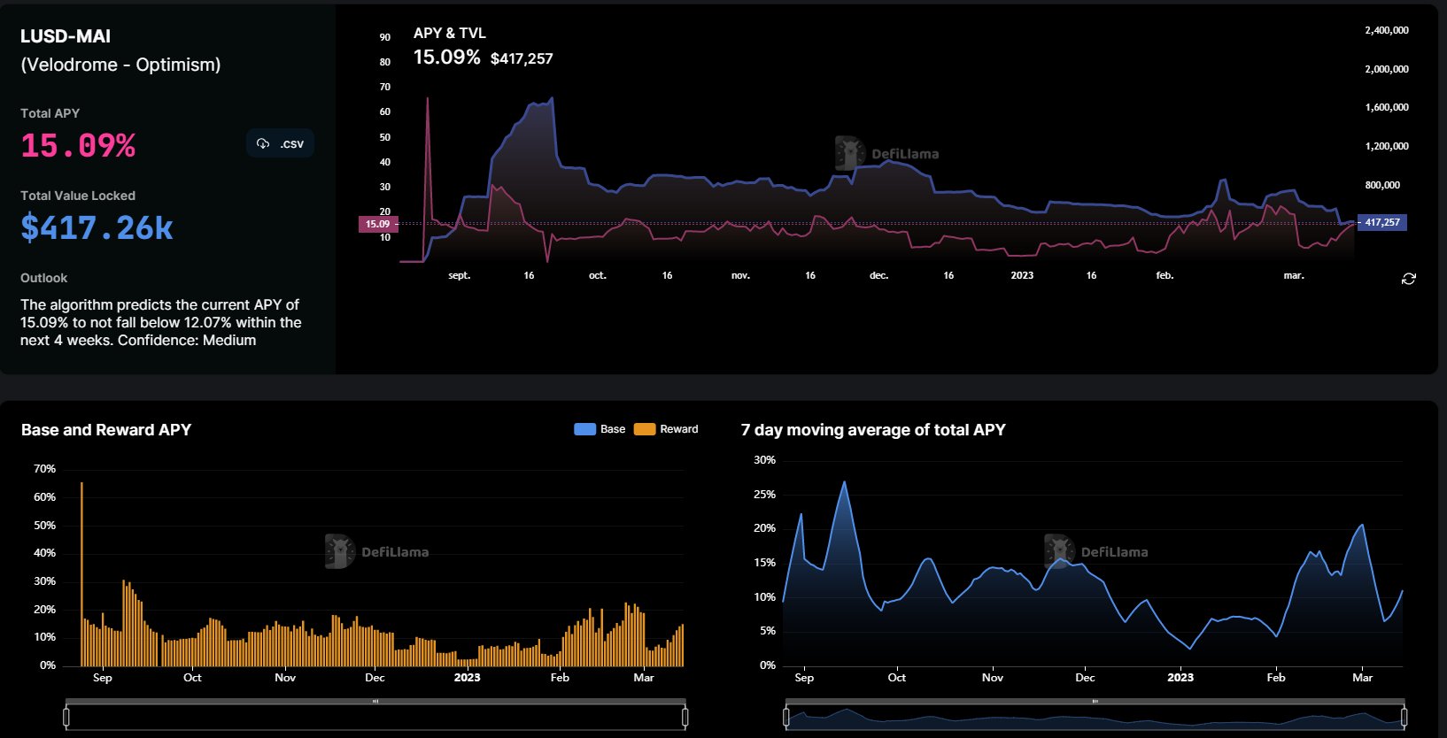 当前,该策略的收益率为 17.5% ,过去 7 天的平均 APY 则为 14% 。没有前几个那么高,但至少 LUSD 和 MAI 作为稳定币似乎是“稳定”的。