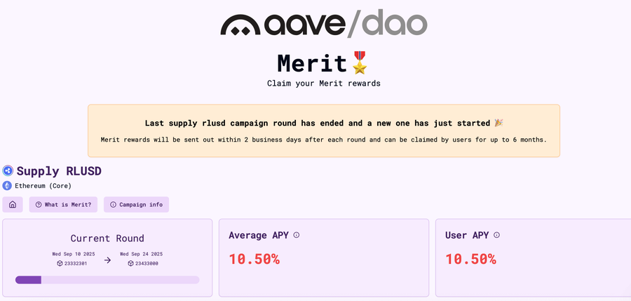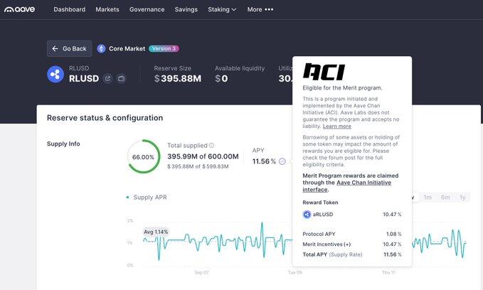 在 Ethereum AAVE V 3 上我们可以看到,提供 RLUSD 可以获得 11.56%的 APR,其中 1.08%收益率来自于 AAVE 中 RLUSD 借款人支付的利息,这部分奖励将自动滚到用户的本金中,另一部份 10.47%的奖励则来自于 Ripple 官方对资金提供者的补贴,补贴将通过 Merit Program 进行发放,并且每半个月统一发放一次,用户可以在 Aave Chan Initiative Dashboard 主动领取。根据笔者的观察,补贴已经持续了几个月,这就意味着这个收益率保持了相当长的一段时间。该场景的参与也较为简单,只需要在 Curve 中兑换 RLUSD,并 Supply 到 AAVE 中即可。