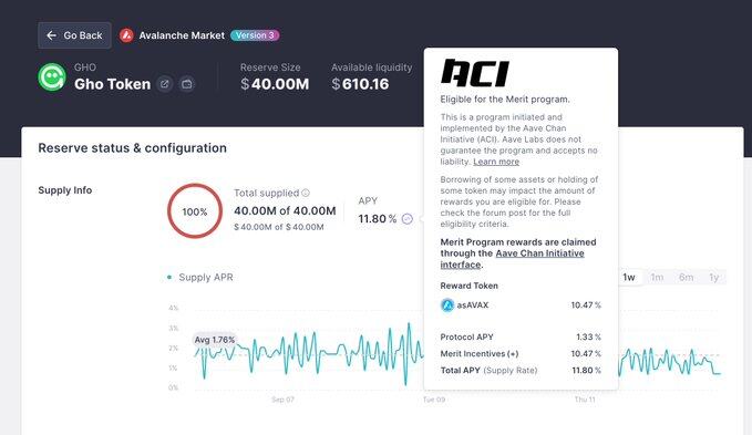 而 Avalanche 则是一个高性能 L 1,虽然在生态建设上逐渐处在落后位置,不过其背后拥有强大的合规资源。与 RLUSD 类似,在 Avalanche AAVE V 3 中提供 GHO 稳定币获得的 11.8% APR 也是由两部分组成,包括 1.33%的借款利率,以及来自于 AVAX 官方补贴的 10.47%收益,这部分是也是通过 Merit Program 进行发放,并且每半个月统一发放一次,用户可以在 Aave Chan Initiative Dashboard 主动领取。且补贴也持续相当长的时间,需要注意的是这部分奖励是以 asAVAX 形式发放,asAVAX 是 sAVAX 在 AAVE 中的存款凭证,而 sAVAX 是 AVAX 生态中头部 Liquid Staking 协议 BENQI 中质押 AVAX 参与 POS 挖矿的存款凭证,如果希望将这部分奖励兑换为其他代币,需要通过 BENQI 进行 unstake 操作,并且冷静期为 15 天,当然这部分代币也是生息资产,可以获得 5%的质押收益。