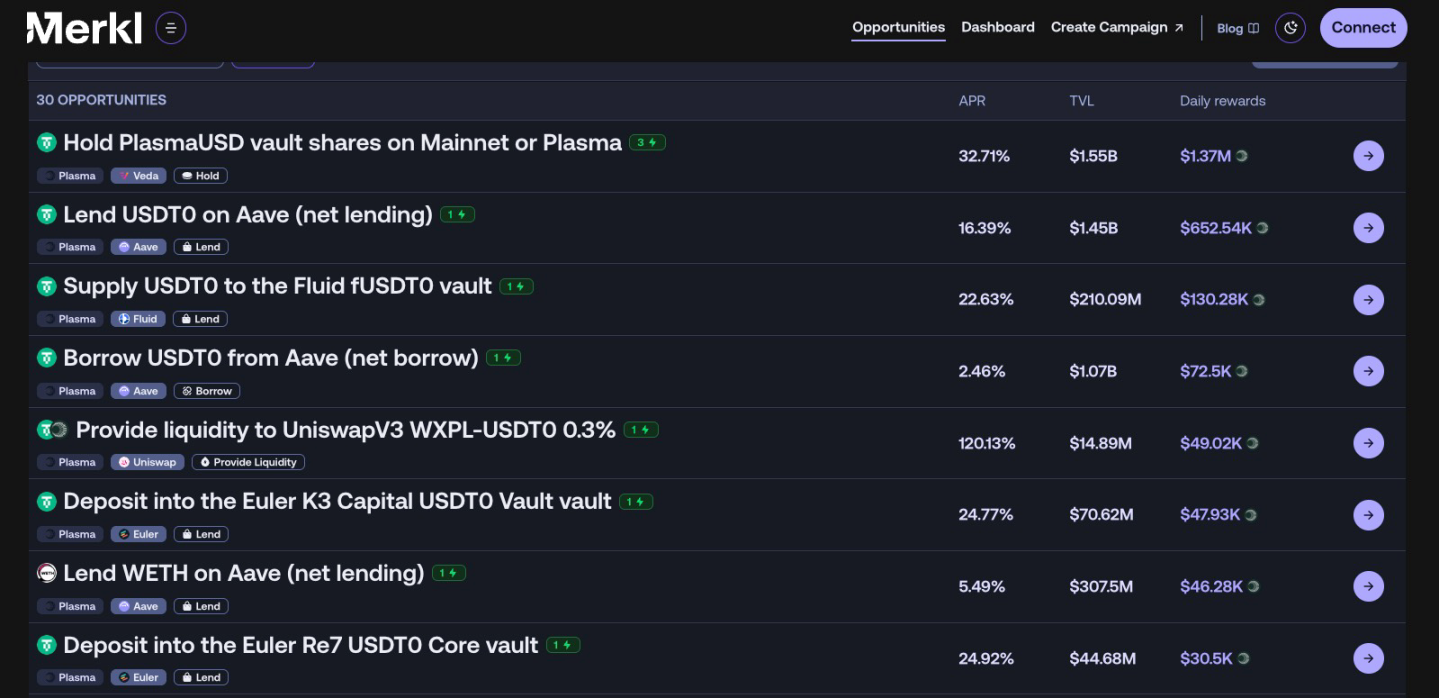 首先来介绍一下如何发现这些理财机会。第一个关键链接是 Plasma 在 Merkl 平台中的专区。Merkl 是一个多链 Web 3 激励分发平台,已为 200+ 协议分配超 2 亿美元流动性和积分奖励,支持流动性挖矿、借贷激励、空投等多种方案,帮助项目高效吸引并留存用户,所以安全性是没有问题的。Plasma 选择通过 Merkl 平台分发奖励,你可以在这个链接中找到所有受到补贴的场景:
