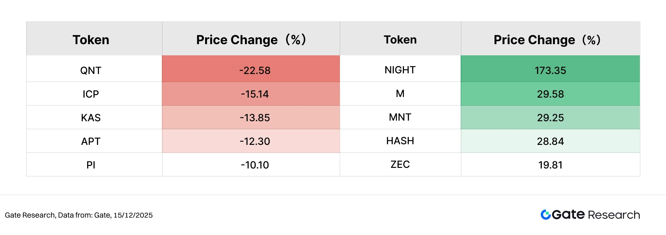 过去两周(12 月 2 日至 12 月 15 日),加密市场在宏观不确定性与叙事快速轮动的背景下呈现高度分化,个别代币涨跌幅显著放大,反映短期资金仍以高波动博弈为主。