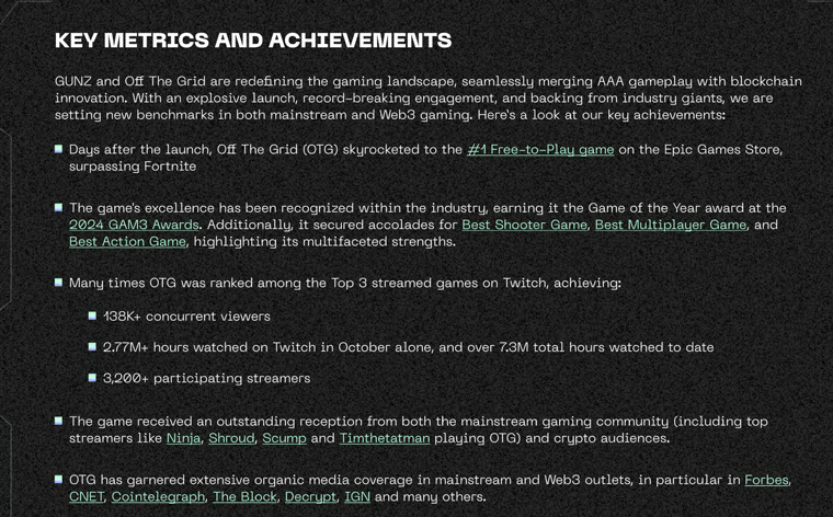 荣获 GAM 3 Awards 多项大奖: 2024 年 11 月,OTG 在 GAM 3 Awards 中斩获「年度最佳游戏」、「最佳动作游戏」等四项大奖,标志着 AAA Web3 游戏的市场认可度显著提升。