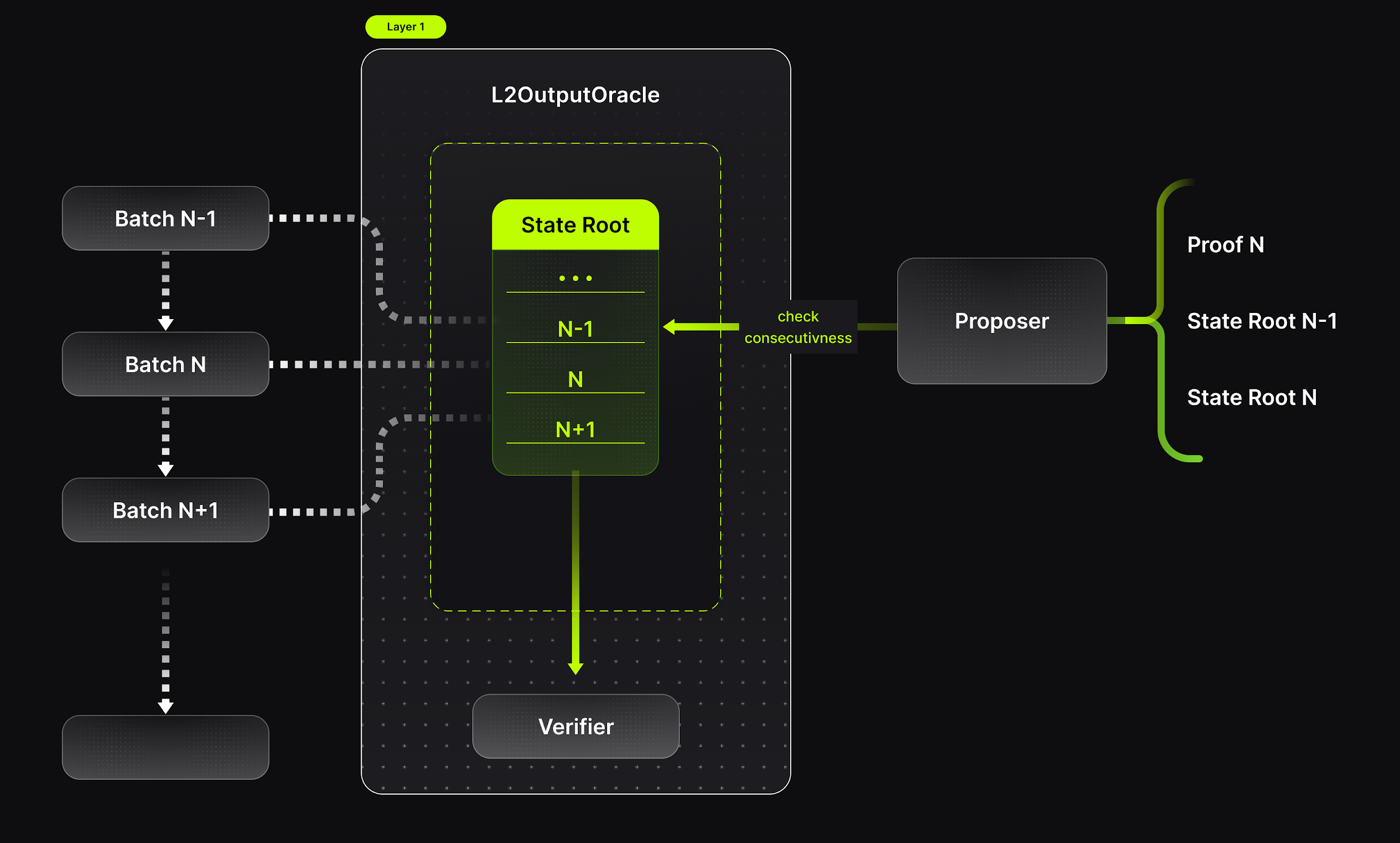 如图所示,在每个 Batch 被提交到链上之后,proposer 也会同步将该 batch 对应的状态根依照顺序写入特定数组中。每当 Proof 需要被提交到合约内进行验证时,proposer 会同时向合约传入对应 batch 和前序 batch 的状态根。在状态根连续性的检验通过后,才会继续在 Verifier 合约中进行 Proof 的验证。