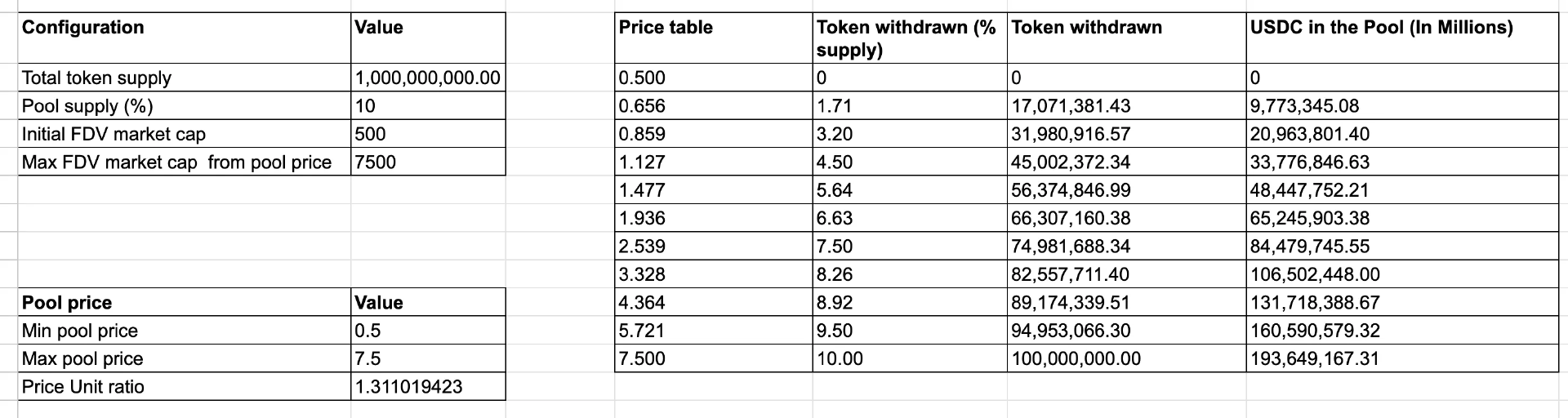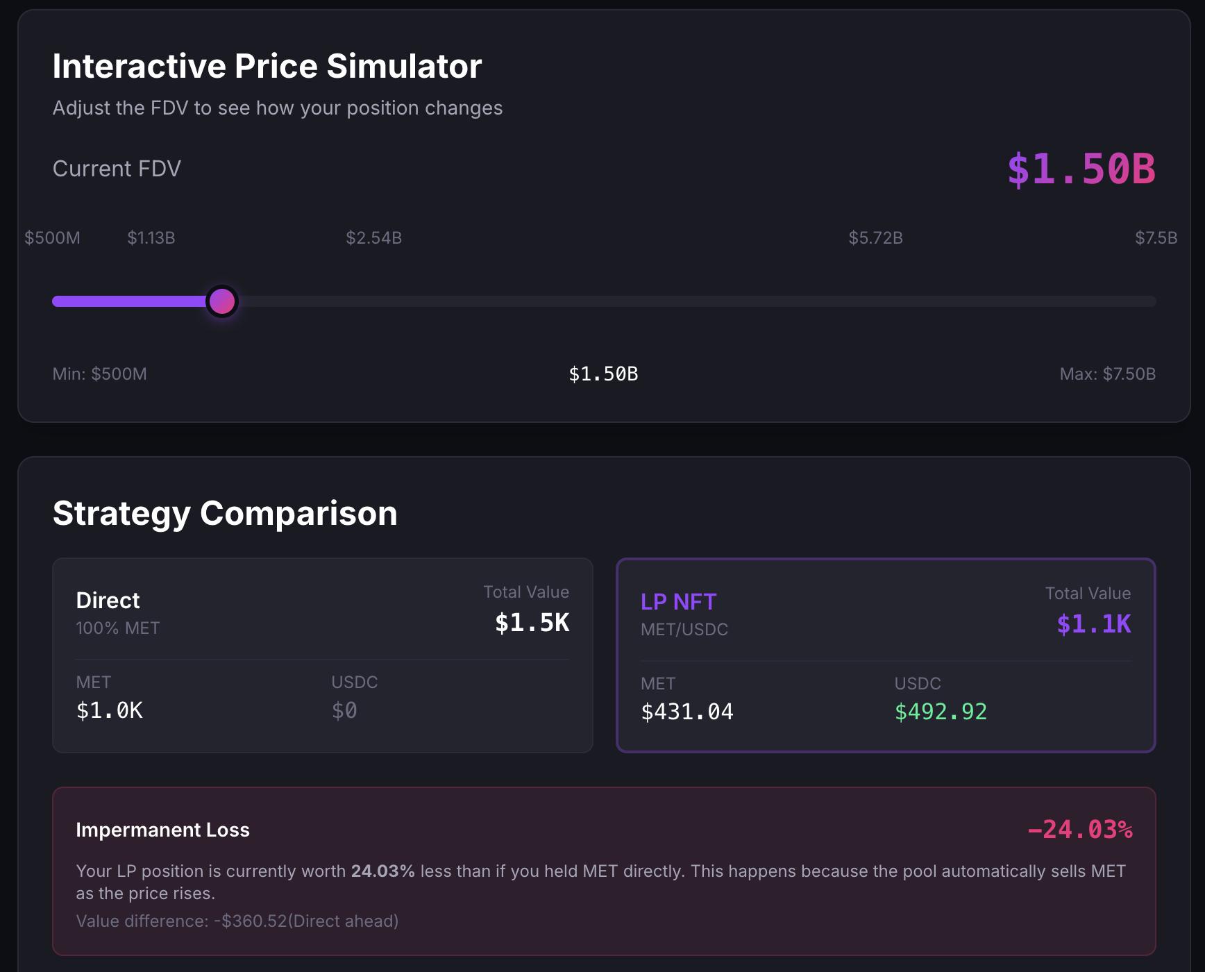 在官方公告中,Meteora 列出了不同价格位置时会被卖出的 MET 比例(最大为 10%,对应 7.5 美元的价格)。以图中最接近盘前估值的数据(1.477 美元)举个例子,即 MET 发行后 FDV 约为 14.77 亿美元,届时将有约 5.64% 的 MET 将从池中提取并被卖出。这意味着,如果你的空投份额是 100 MET,此时其中 56.4 MET 将以 48.4 USDC 的价格提前出售 —— 相较于以 1.477 美元的价格全仓抛售可获得的 147.7 美元,此时若撤出流动性,空投的 MET 价值仅剩 64.4 美元(33.6 * 1.477),再加上 USDC 的总价值约为 112.8 美元,折算后预计将出现 23.6% 的无常损失 —— 不过在实际情况下,用户参与 Liquidity Distributor 还可以分享前文提到的反狙击费用以及交易费用收益,这里的收益与潜在损失的估测便是要不要参与 Liquidity Distributor 的核心博弈点。