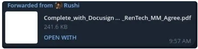 Movement 的联合创始人 Rushi Manche 将第一份 Rentech 合同转发给 Movement 生态系统的一名员工。(由 CoinDesk 获取)