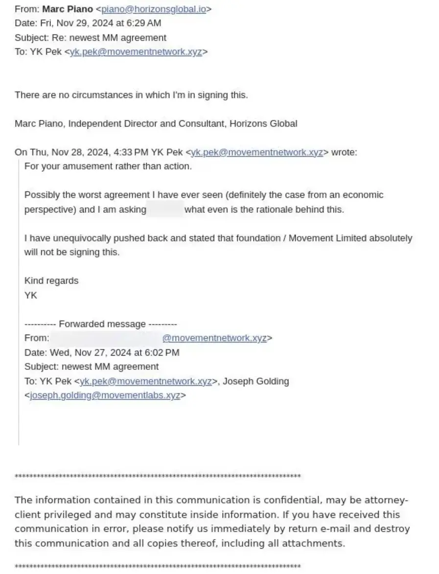 基金会的法律顾问 Pek 在邮件中指出,该协议“可能是我见过最糟糕的一份协议”。在另一份备忘录中,他警告称此举将把 MOVE 市场的主导权拱手交给一个身份不明的外部实体。基金会在英属维尔京群岛的董事 Marc Piano 也拒绝签署该协议。