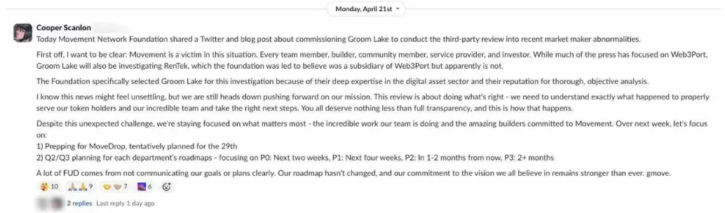 Movement 联合创始人 Scanlon 在发给员工的 Slack 信息中表示,公司已聘请外部审计机构 Groom Lake,开展针对近期做市行为异常的第三方独立调查。