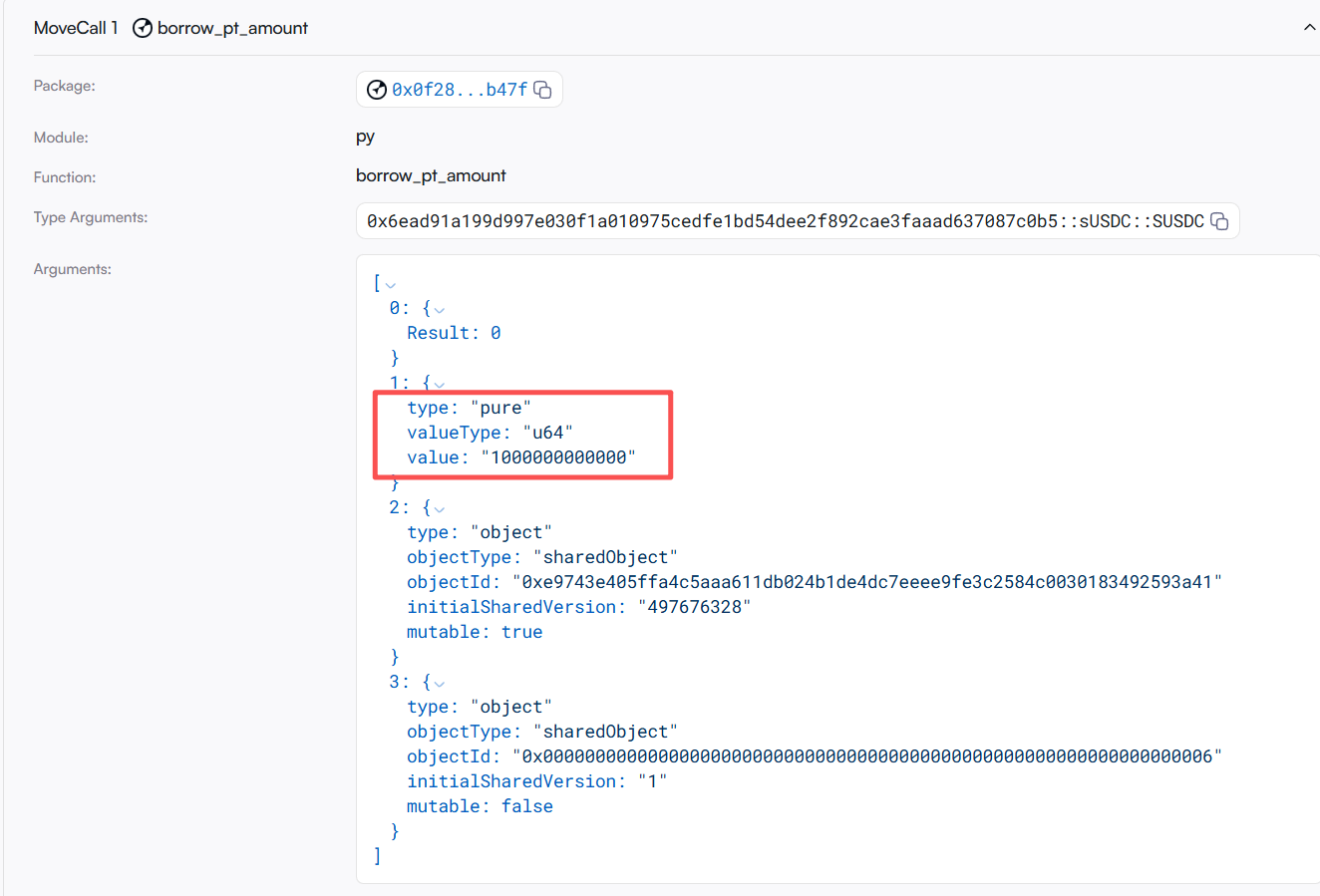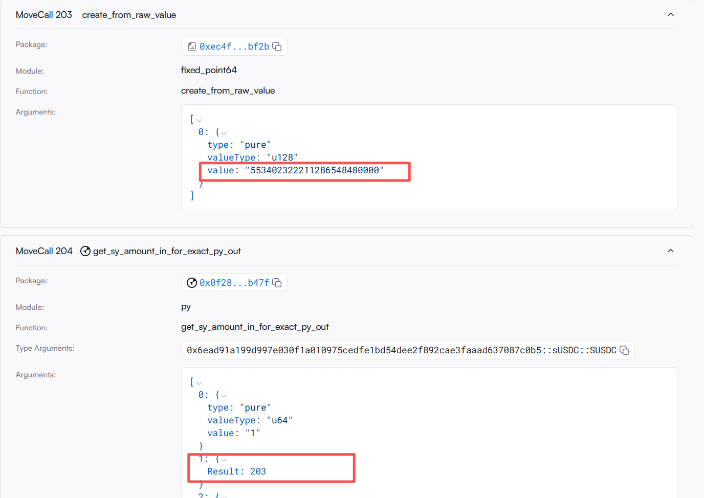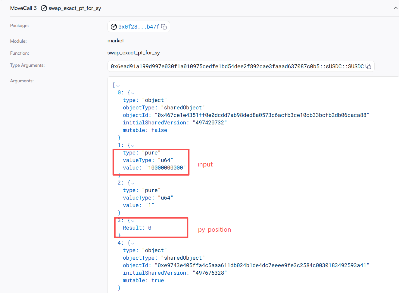 4. 通过 py.get_sy_amount_in_for_exact_py_out 计算出 PY 输出所需要的 SY 的输入量,这里攻击者将 py_index 传入一个构造的极大的数 553402322211286548480000,破坏了原本的结构。