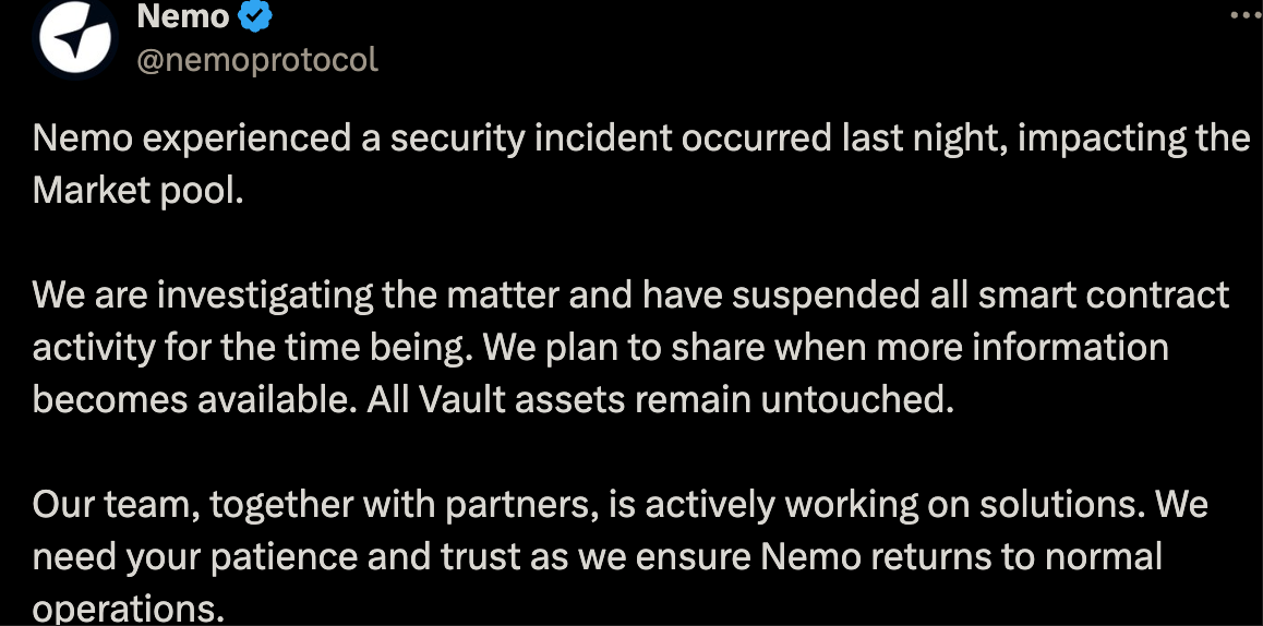 在攻击发生后 Nemo 团队紧急暂停了智能合约功能,并开始调查攻击事件。调查结果表明 259 万美元资产损失攻击源于在未充分审计的情况下上线新功能。