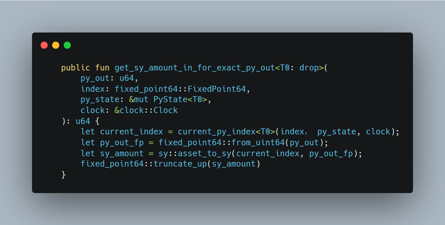 ·py.get_sy_amount_in_for_exact_py_out 计算出 PY 输出所需要的 SY 的输入量,然而这里 index 没有任何限制