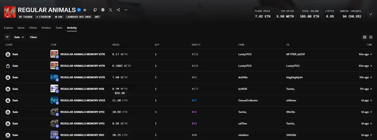在昨天,多幅 Regular Animas 以超过 10 ETH(约 35000 美元)的价格在 OpenSea 上成交,而这个作品是在巴塞尔艺术展上免费送出的,共 256 张。按照这个价格计算,beeple 在巴塞尔艺术展上送出了价值近千万美元的 NFT。