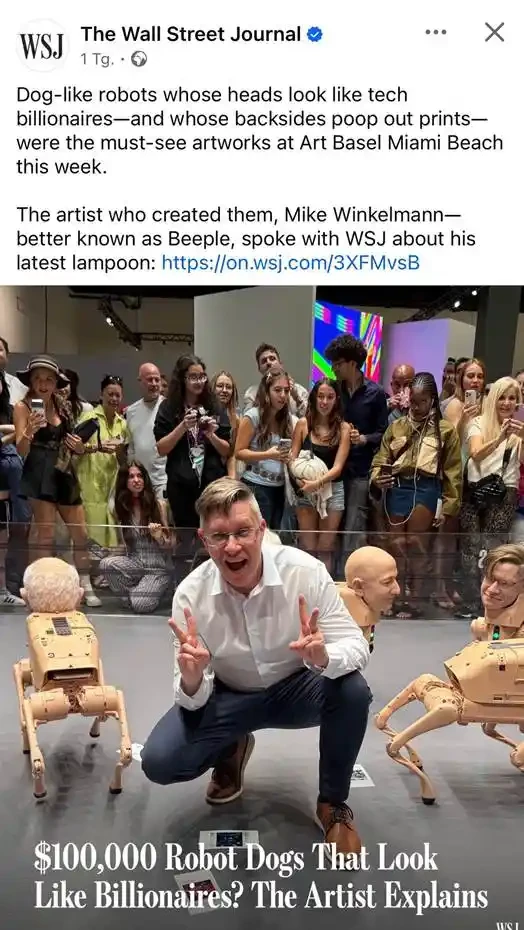 此次 beeple 的机器狗展览,不但在币圈因为价格而得到关注,也得到了 WSJ 这样的传统媒体报道。