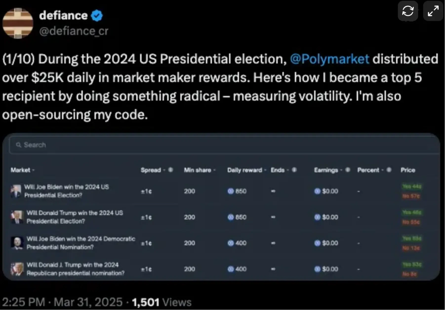 一位名叫 @defiance_cr 的交易者接受了 Polymarket 官方的采访,详细分享了他如何构建自动化做市系统。在巅峰时期,这套系统每天产生 700-800 美元的利润。