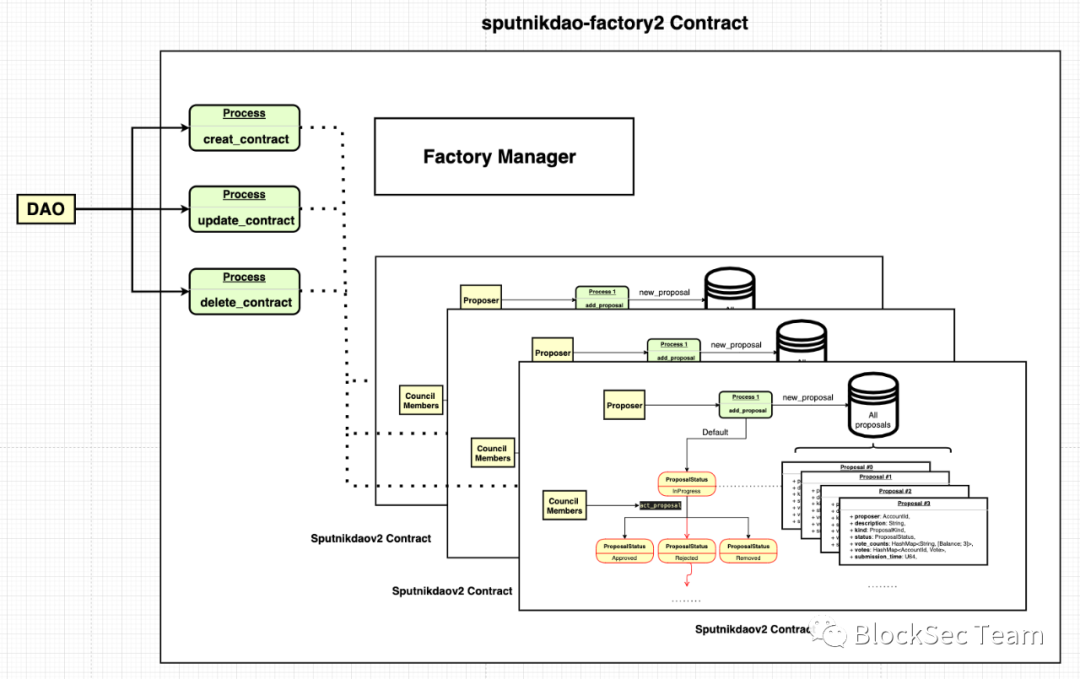 sputnikdao-factory2合约:该合约利用创建型工厂设计模式(Factory Pattern)实现了该平台下所有去中心化自治组织(DAO)实例的统一创建与管理。