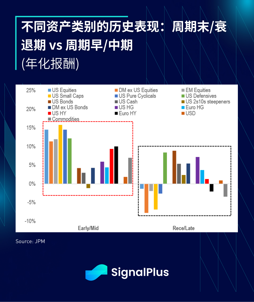 不同资产类别的历史表现显示,在周期末期和衰退期间似乎持有防御型股票比大型股票更好,从历史表现来看,防御型股票以外的股票报酬可能会低于平均水平,同时在周期末收益率曲线也会倾向走陡,这也是过去一个月我们看到的情况。