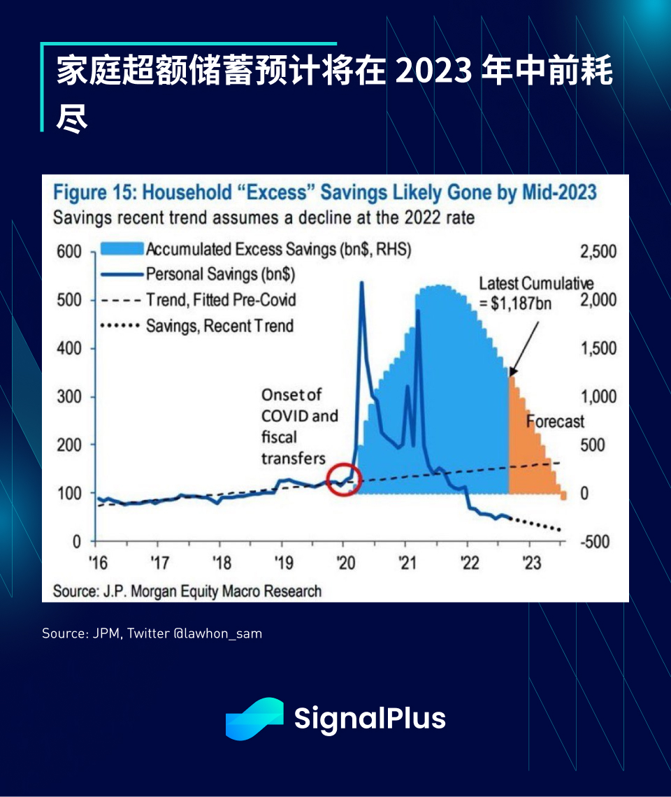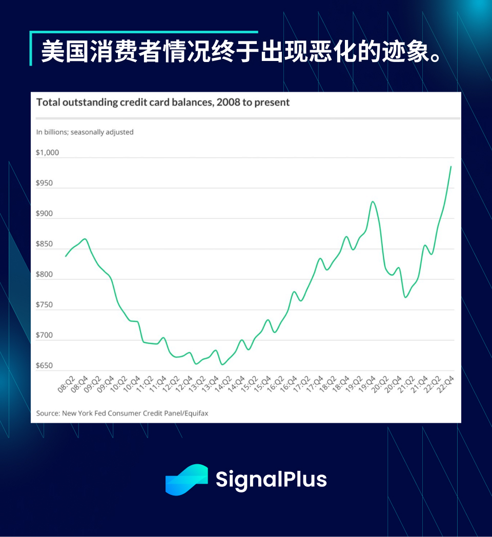 美国消费者情况终于出现恶化的迹象。美国消费者信用卡总余额已突破历史新高,自疫情时期以来一路直线上升,摩根大通预估,家庭超额储蓄将在 2023 年中前消耗殆尽,总储蓄率目前处于 2007 年以来的最低水平,而此时家庭负担能力也徘徊在历史低点附近,且裁员情况也终于开始增加。