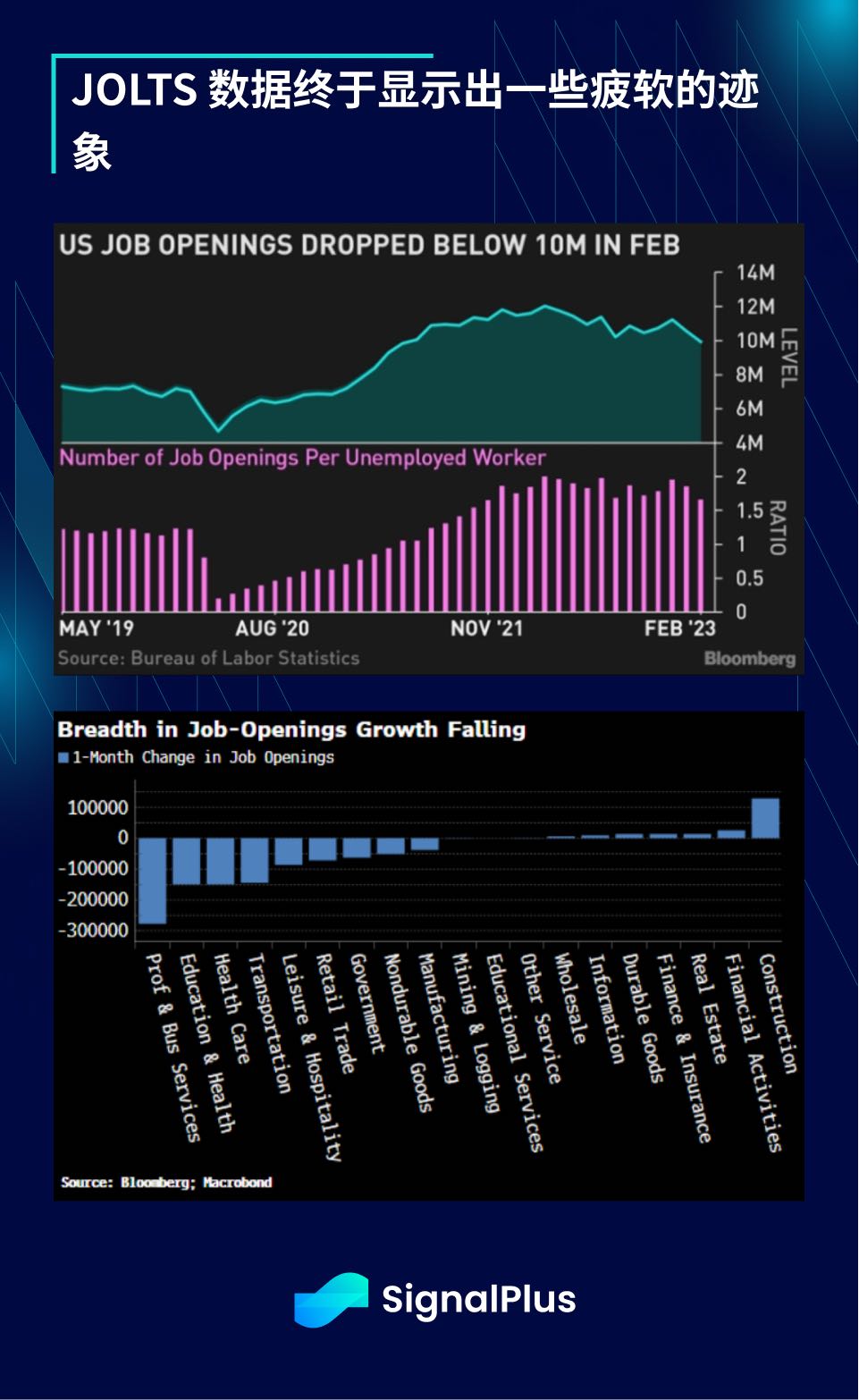 JOLTS 数据终于显示出一些疲软的迹象, 2 月份职位空缺数减少 63.2 万至 993.1 万,是 2021 年 5 月以来最低;职位空缺与失业人数比率为 1.7 ,职位空缺率从 1 月份的 6.4% 降至 6% ,也低于去年 3 月的高点 7.4% ;招聘人数从之前的 632.7 万降至 616.3 万人,招聘速度滑落至 4% ,是 2020 年 12 月以来最低;职位空缺出现疲软显现在所有行业中,建筑业是唯一出现增长的行业。