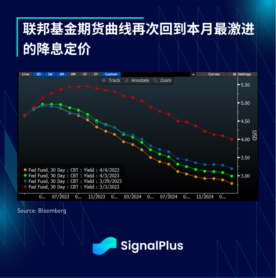美债收益率全面下跌,随著市场预测 5 月 FOMC 加息的概率回落至 50% 以下, 2 年期收益率下跌 12.5 个基点至 3.84% , 2/10 年期收益率曲线走陡 7 个基点至 -49 个基点,此外,联邦基金期货曲线又再次定价年底前的累计降息将接近 80 个基点,整个远期曲线落至本月的最低水平。