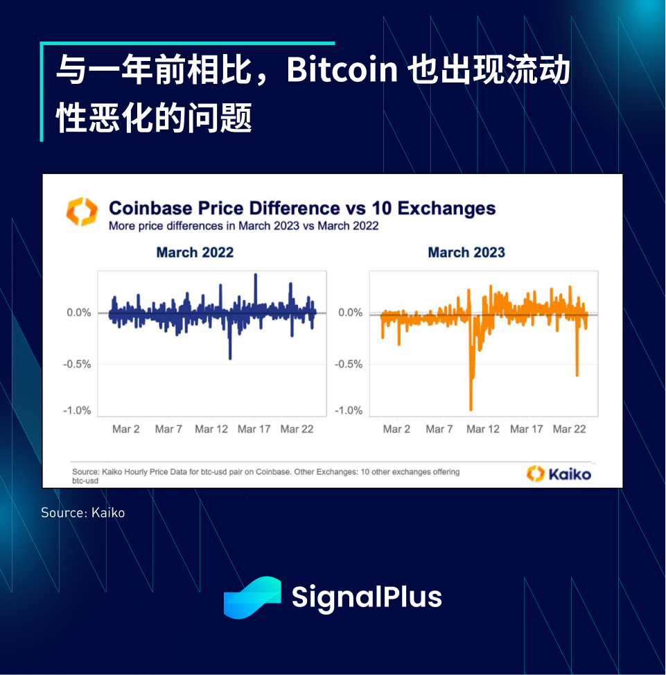 市场压力指标显示二级市场流动性状况依然十分严峻,虽然股票市场和高评级信用债的表现相对正常,但由于融资利率飙升,MBS/ABS/CLO 仍然处于困境,且整体流动性状况接近 90% 的压力水平,导致市场波动加剧。 TradFi 和加密货币市场都是同样的情况,BTC 的市场深度相较于 2022 年明显恶化,似乎今年为止的回撤给市场参与者带来许多痛苦,做市商也缺乏信心。
