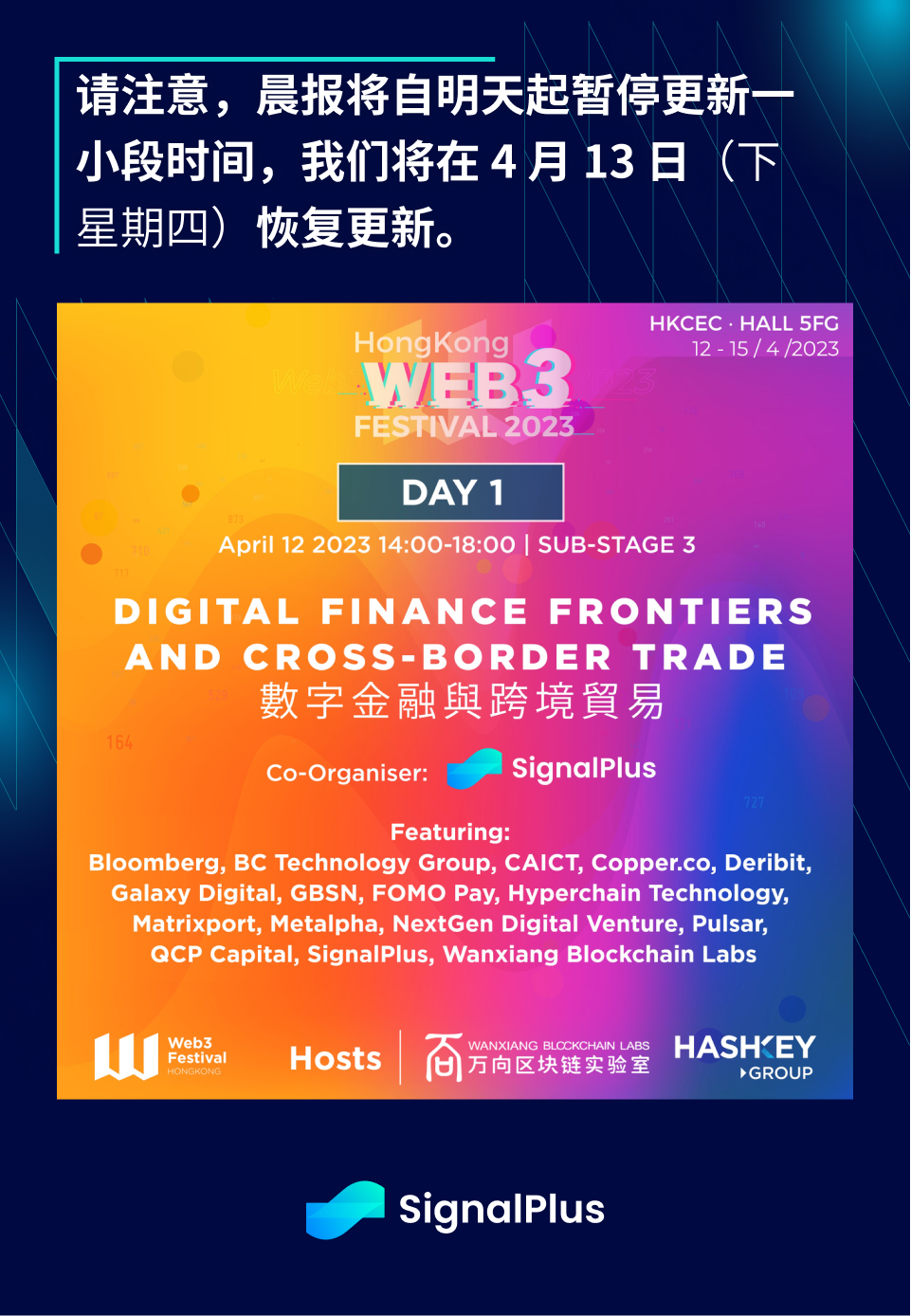 请注意,晨报将自明天起暂停更新一小段时间,我们将在 4 月 13 日(下星期四)恢复更新。SignalPlus 团队下周将参与万向区块链实验室和 HashKey Group 在香港会展中心举办的 Web3 Festival,我们在 4 月 12 日下午准备了一系列精彩丰富的主旨演讲和圆桌论坛环节,欢迎在香港的朋友们前来亲身参与,我们非常期待与您见面!