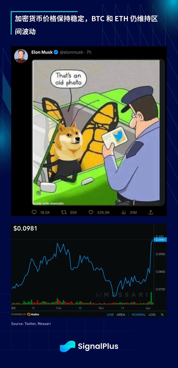 - 加密货币价格保持稳定,BTC 和 ETH 仍维持区间波动,最有趣的一条消息可能是 Elon Musk 将推特标志从蓝鸟变成了 Dogecoin,随著这位富有创意的企业家继续展示对这个代币的情有独钟,狗狗币价格也因此飙升了 20% 。