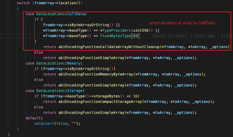 当源数据存储位置为 Calldata,且源数据类型为 ByteArray,String,或者源数组基础类型为 uint 或 bytes 32 时进入ABIFunctions::abiEncodingFunctionCalldataArrayWithoutCleanup()
