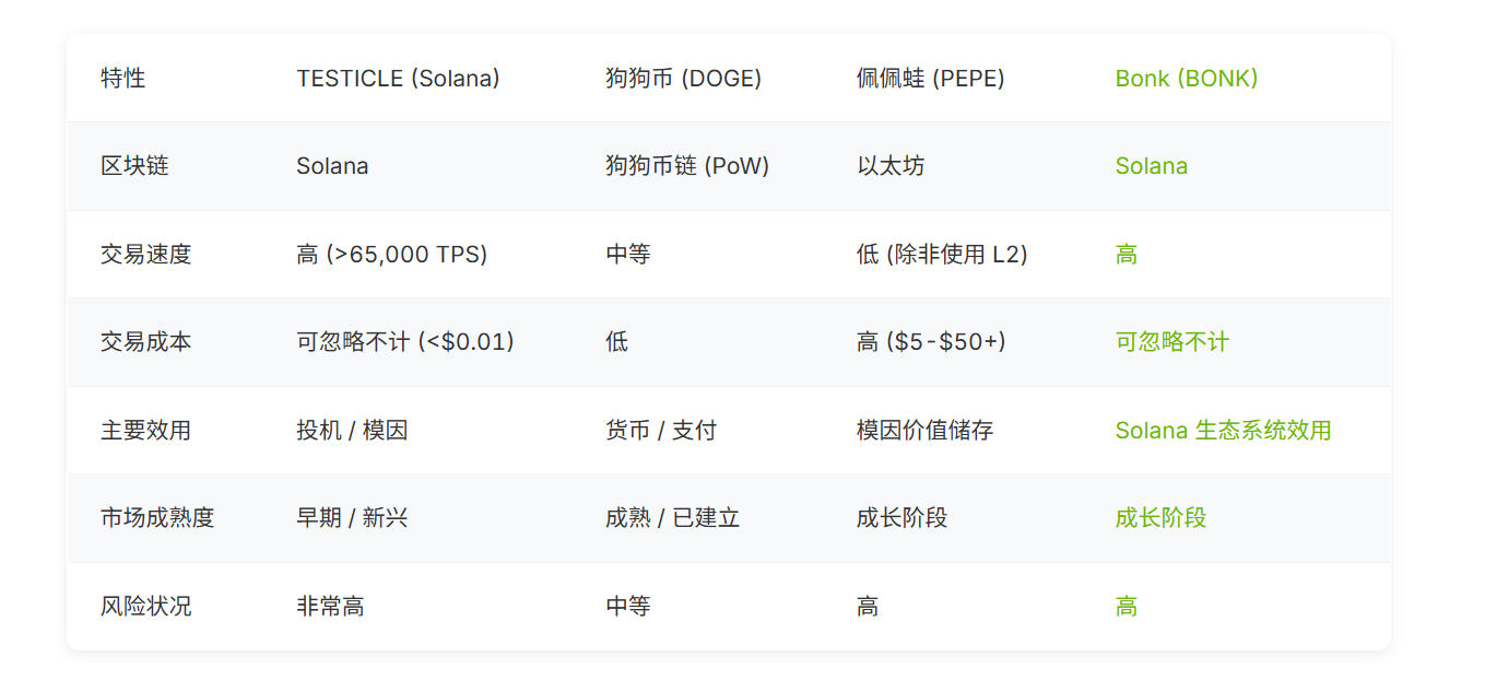 如上表所示,TESTICLE 具有与 BONK 相同的技术优势(速度快、成本低),但缺乏 DOGE 那样悠久的历史。它是一个“早期阶段”的投资,提供更高的潜在上行空间,但风险也显著更高。