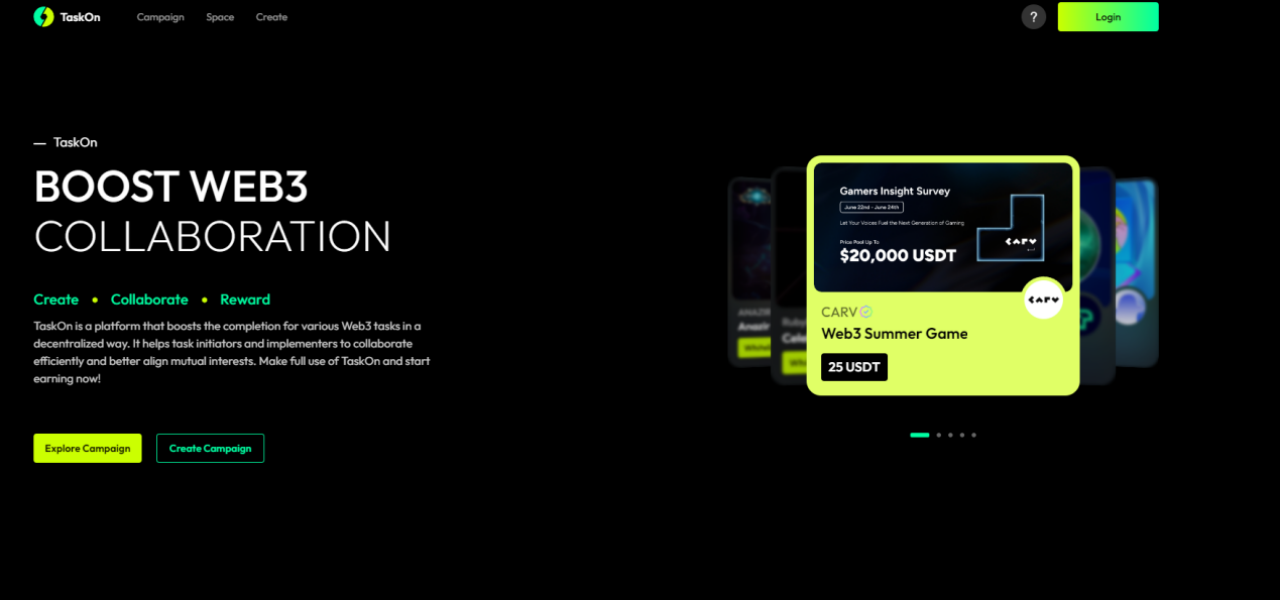 TaskOn 是一个 Web 3 任务协作平台,致力于 Web 3 项目的营销和运营增长。TaskOn 是 Moonbeam 系列应用的一部分。平台能够提供一些自动化功能,减少操作流程。例如,API-Verified 可以帮助自动验证参与者是否进行产品特定操作。该平台还具备自动发奖功能,可以在活动结束后代替活动方立刻发奖,而活动方所有的操作只有创建活动,将足够的奖励(Token 或 NFT)充进自己的 TaskOn 账户;TaskOn 还可以替活动主办方创建活动,进一步减少主办方的操作。在当前的 Web 3 任务平台中,TaskOn 是功能精简易用,发展速度较快的平台之一。该平台因具备一系列防机器人措施,是目前真实用户率最高的平台之一(高达 92.9% )。平台商业模式偏 to B, 属于流量类平台。