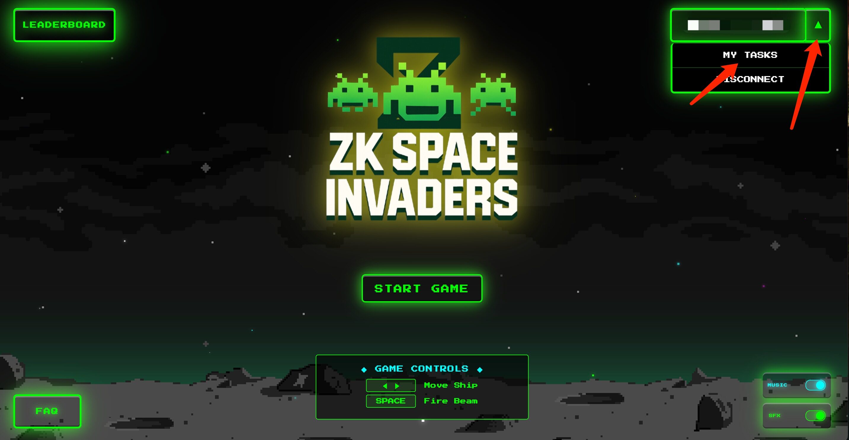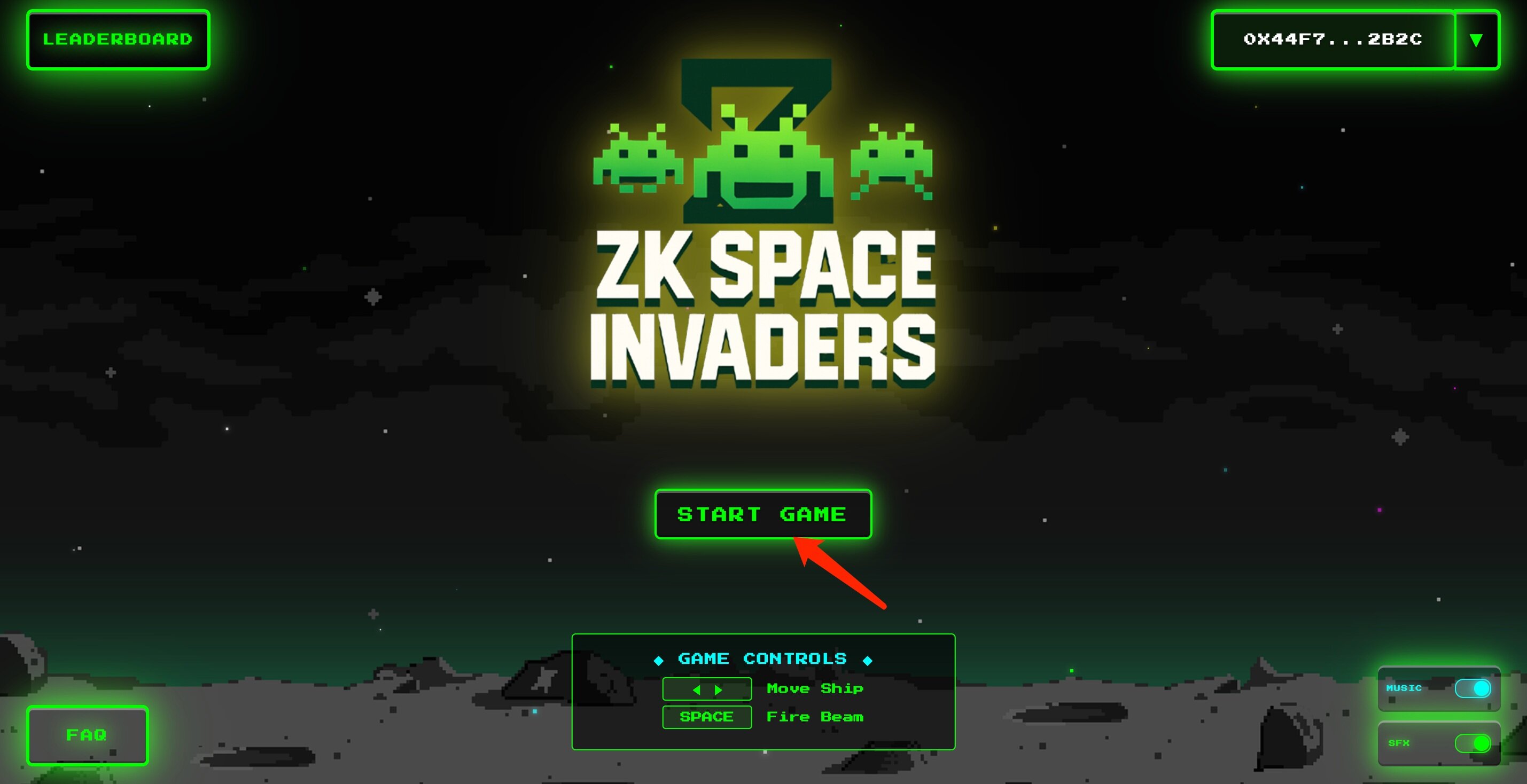 STEP 1. 进入游戏网站,连接钱包,点击“START GAME”,输入游戏昵称后开始游戏,左右控制移动,空格发起攻击,闯关获积分,尽可能存活久些。
