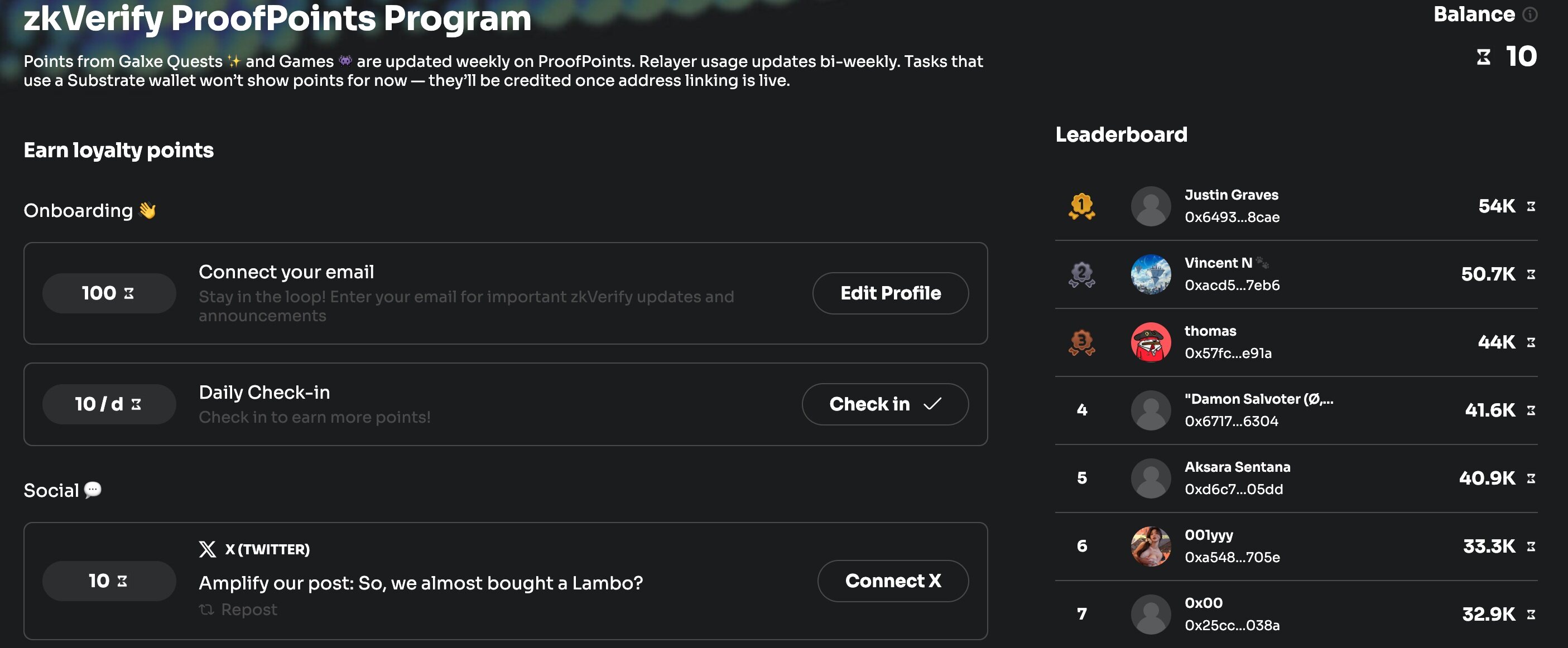 第一,zkVerify ProofPoints 活动(链接:https://points.zkverify.io/loyalty)。