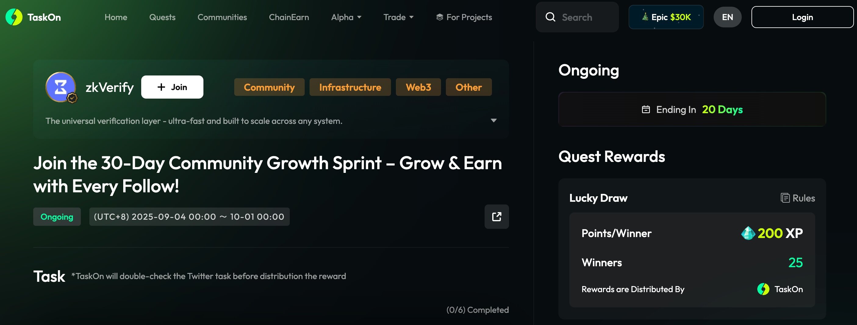 第三,zkVerify 在 TakeOn 上的任务(链接:https://taskon.xyz/quest/811092355)。