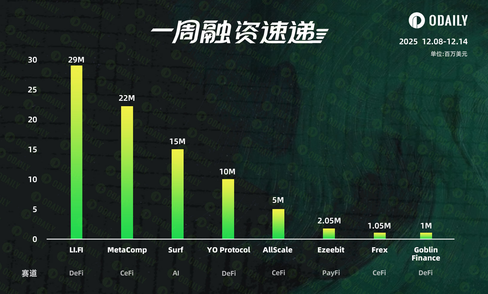 根据 Odaily 星球日报不完全统计,2025 年 12 月 8 日至 12 月 14 日,全球区块链领域共披露 8 起融资事件,较前一周的 10 起略微下降;融资总额为 8510 万美元,较前一周的 1.76 亿美元大幅下降。
